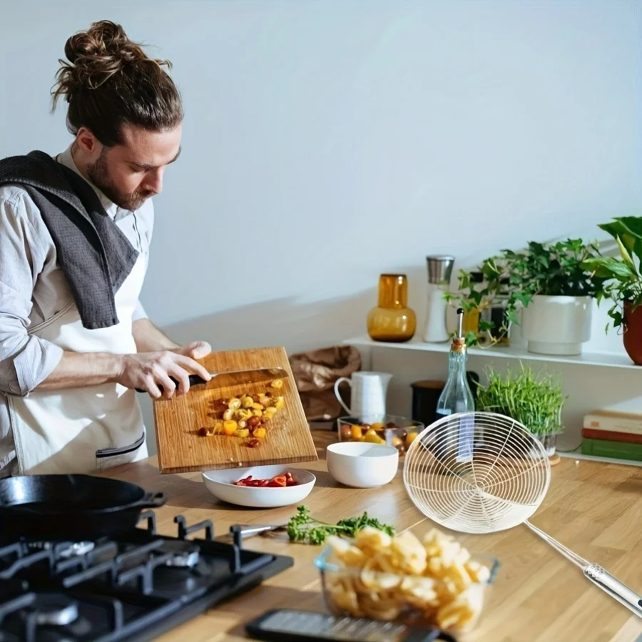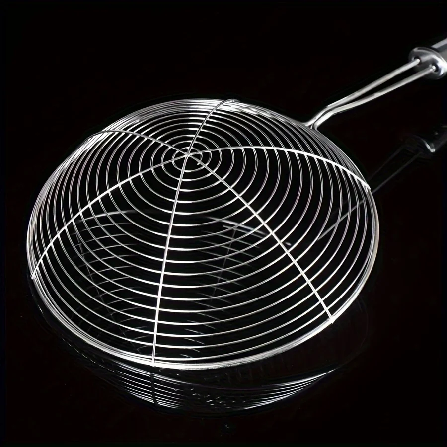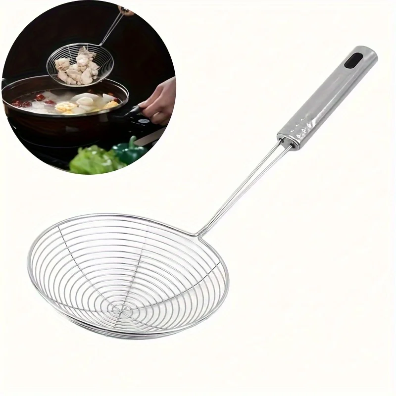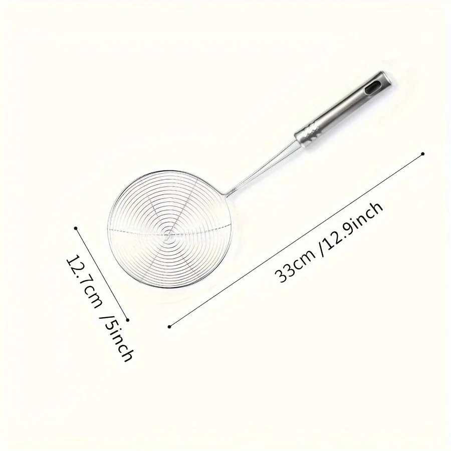 Cucharón colador de acero inoxidable con mango, cuchara espumadera de alambre duradera para cocinar, freír y uso en cocina, 1 ud.