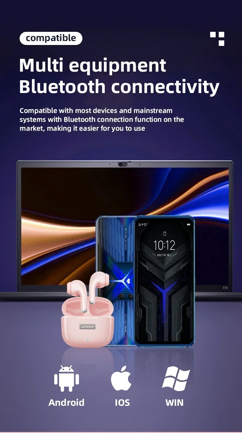 • Conexión inalámbrica Bluetooth:Experimenta música ininterrumpida con los auriculares Lenovo lp40pro, que cuentan con una conexión inalámbrica Bluetooth.Disfrute de libertad de movimiento y una calidad de audio perfecta.