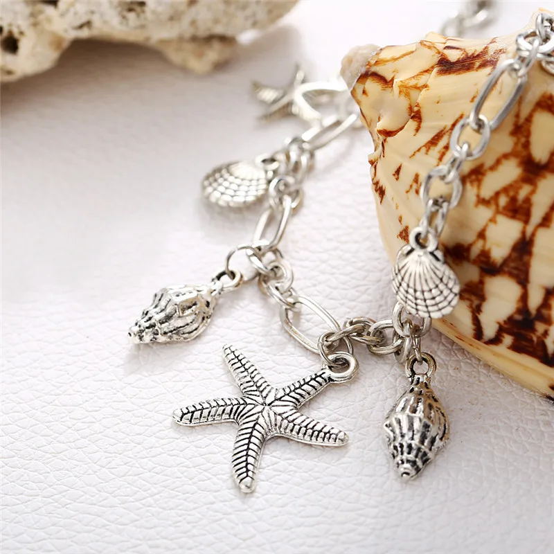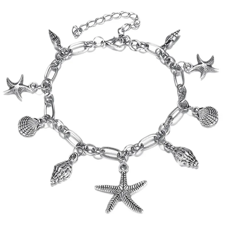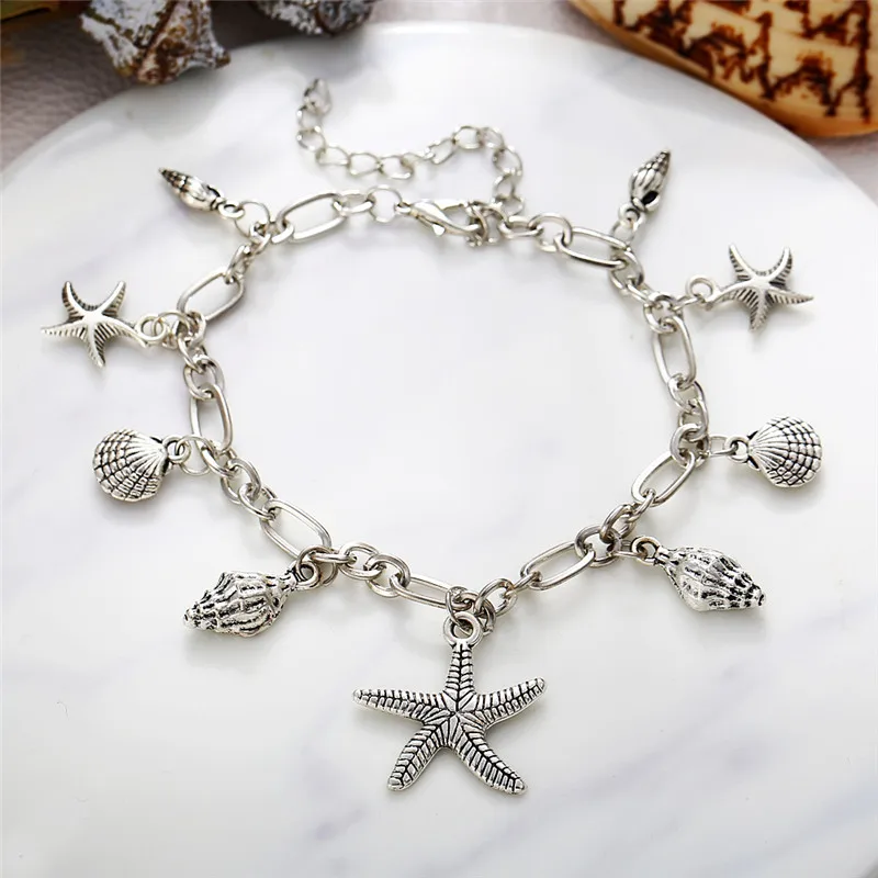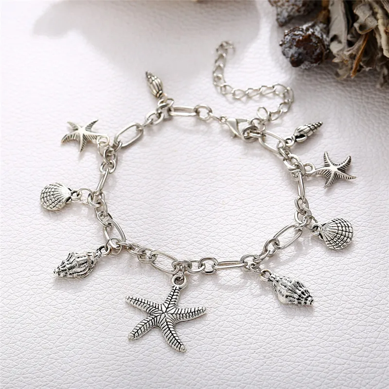 Pulseras tobilleras Vintage con forma de estrella de mar para mujer, tobillera bohemia de conchas de Color plateado, cadena para pierna, joyería para descalzos, Verano